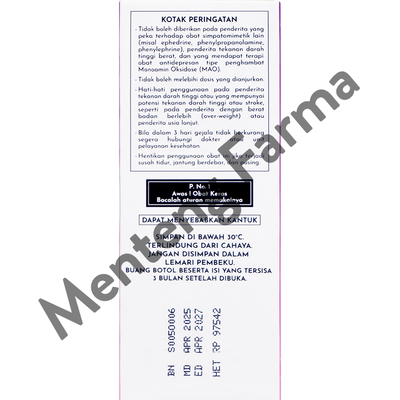 - Tidak boleh diberikan pada penderita yang peka terhadap obat simpatomitetik lain (misal ephedrine, phenylpropanolamine, phenylephrine), pederita tekadan darah tinggi berat, dan yang mendapat terapi obat antidepresan tipe penghambat Monoamin Oksidase (MAO)