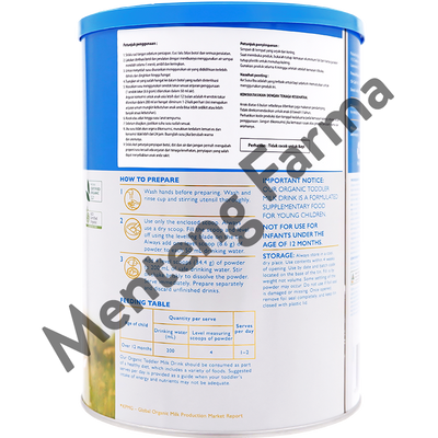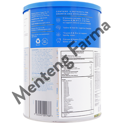 Organic milk solids, Organic Skim Milk, Organic Whey Powder (Demineralized), Organic Lactose, Organic Vegetable Oils (Sunflower Oil, Coconut Oil, Canola Oil), Galacto-oligosaccharides (GOS), Milk Minerals, Fish Oil (source of DHA), Mortierella Alpina Oil (source of ARA), Calcium Carbonate, Magnesium Chloride, Potassium Citrate, Ascorbyl Palmitate, Vitamin A, Vitamin D, Folic Acid, Biotin, etc.