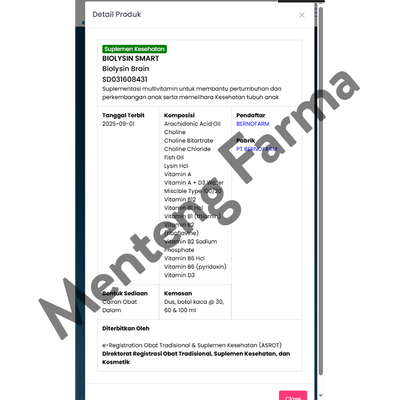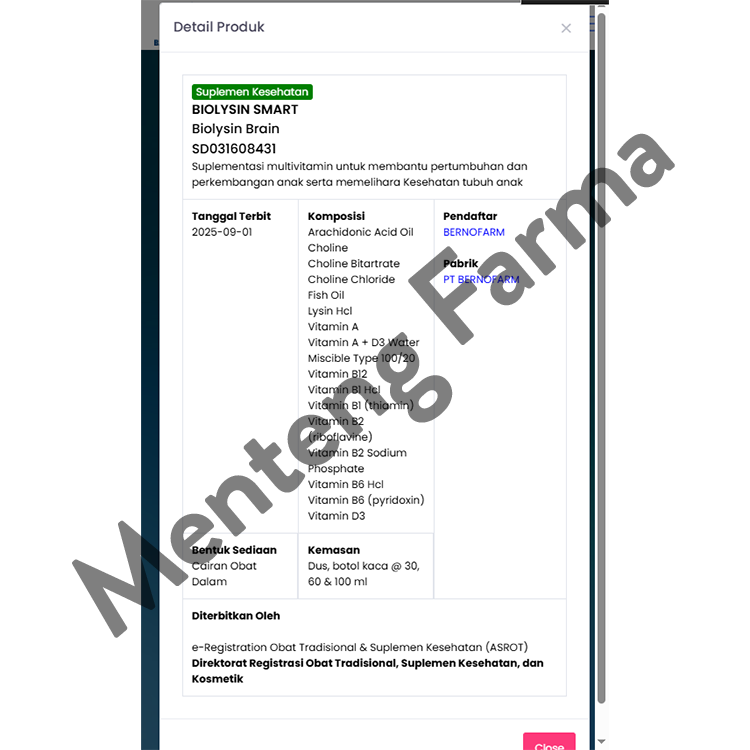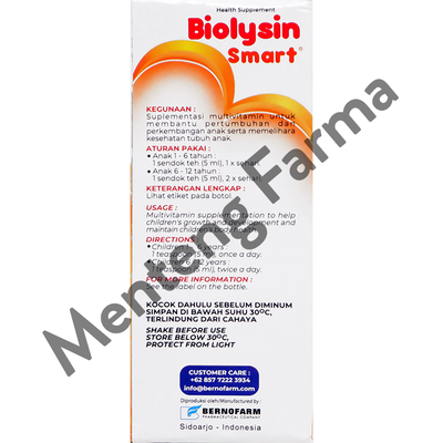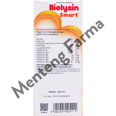 Biolysin Smart Syrup merupakan suplemen kesehatan anak yang berfungsi memenuhi kebutuhan vitamin dan Lysine pada anak-anak di usia pertumbuhan serta membantu memelihara daya tahan tubuh. Mengandung bahan-bahan yang memiliki manfaat dalam membantu meningkatkan nafsu makan anak, meningkatkan daya tahan tubuh serta membantu dalam memenuhi kebutuhan gizi pada anak. Memiliki rasa dan aroma jeruk yang digemari oleh anak-anak.