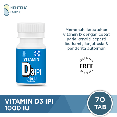 - IPI Vitamin D3 1000 IU, Bantu jaga kesehatan tulang, gigi, dan daya tahan tubuh. Cocok untuk yang jarang terpapar sinar matahari. Dukung penyerapan kalsium & cegah tulang keropos sejak dini.
