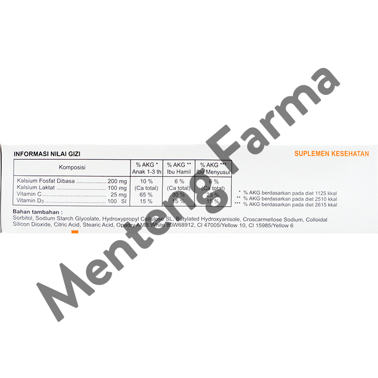 Kalsium Fosfat Dibasa 200 mg, % AKG (Anak 1-3 th) : 10 %, % AKG (Ibu hamil) : 6 %, % AKG (Ibu menyusui) : 6 %
