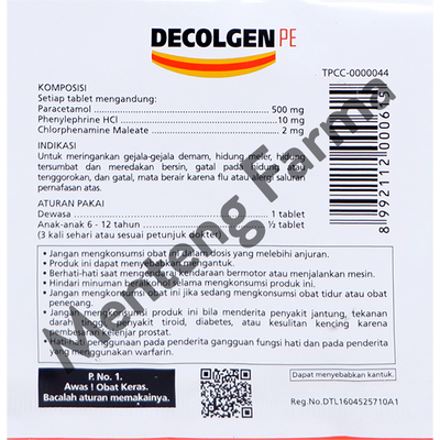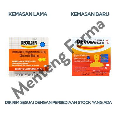 Decolgen PE adalah obat yang digunakan untuk mengobati gejala flu seperti demam, sakit kepala, hidung tersumbat, dan bersin-bersin. Decolgen PE tablet mengandung paracetamol, obat yang memiliki aktivitas sebagai antipyretic sekaligus analgetic, phenylpropanolamine, obat nasal decongestan yang merupakan stereoisomer dari norephedrine, dan chlorpheniramine maleate, obat alergi golongan antihistamin.