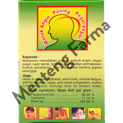 Bahan aktif per gram : Peppermint Oil 30.45%, Camphor 11.10%, Base ad 100%