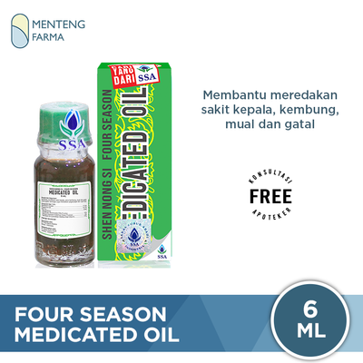 Four Season Medicated Oil yang berfungsi membantu menghilangkan gejala sakit kepala, flu diare, sakit perut, digigit serangga dan lain - lain. Dikemas dalam botol kecil sehingga mudah bagi anda untuk dibawa kemana - mana agar dapat digunakan kapan saja. Tersedia dalam 3 macam ukuran 12ml, 20ml dan 40ml. Bau nya yang menyegarkan dapat juga membuat nafas menjadi lebih lega. untuk penggunaannya dapat digosokan pada bagian yang dinginkan.