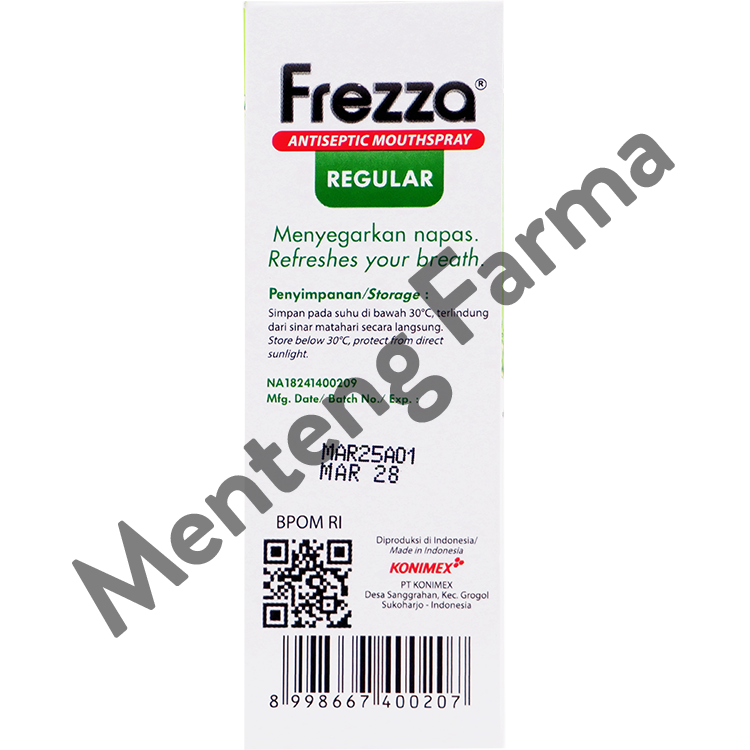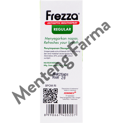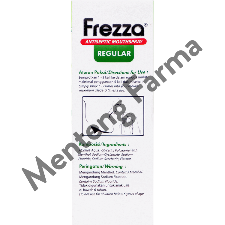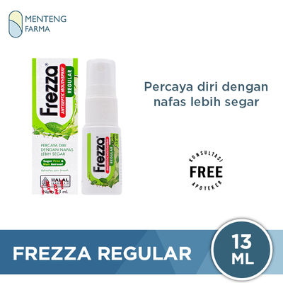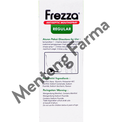 Frezza Antiseptic Mouthspray Regular mengandung klorheksidin diglukonat, bahan aktif yang efektif membunuh bakteri penyebab bau mulut. Mouthspray ini juga mengandung mint dan mentol untuk memberikan kesegaran dan aroma yang menyegarkan pada napas Anda. Selain itu, Frezza Antiseptic Mouthspray Regular juga tidak mengandung gula, sehingga aman untuk digunakan oleh penderita diabetes atau yang sedang menjalani diet rendah gula.