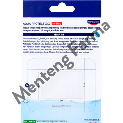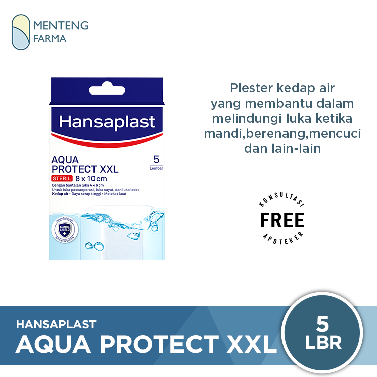 Hansaplast Aqua Protect adalah plester kedap air yang membantu dalam memberikan perlindungan pada luka. Dapat digunakan saat mandi, berenang, mencuci atau aktivitas lainnya, Membantu melindungi luka dari kotoran, bakteri dan paparan air. Mencegah terjadinya infeksi serta ramah dan aman digunakan pada kulit. Dengan ukuran XXL (8 X 10 cm) yang memiliki daya serap tinggi san melekat dengan kuat