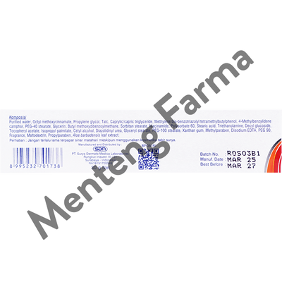 Tabir surya yang diformulasikan secara khusus untuk melindungi kulit dari pengaruh buruk paparan sinar matahari terutama sinar UVA-UVB yang merugikan kulit seperti kemerahan, rasa terbakar, bintik hitam karena matahari dan kekeringan kulit serta efek penuan dini. Diperkaya dengan Whitening Agent dan Vitamin E serta Aloe Extract untuk membantu mencerahkan warna kulit sekaligus merawat kelembapan alaminya. Penggunaan secara teratur akan membantu menjaga kulit tetap sehat dan kulit terasa lebih lembut serta tampak lebih cerah memukau meskipun beraktivitas di bawah sinar matahari. Sesuai untuk semua jenis kulit.