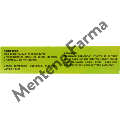 Tiap tablet kunyah mengandung Cholecalciferol 2000 IU setara dengan Vitamin D3 50 mikrogram