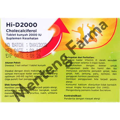 Hi-D 2000 Vitamin D3 merupakan suplemen kesehatan yang membantu memenuhi kebutuhan Vitamin D dengan cepat pada kondisi tertentu, seperti lanjut usia dan/atau risiko tinggi penderita penyakit infeksi atau penyakit autoimun.