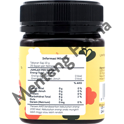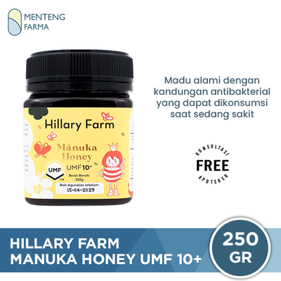 Manuka Honey Hillary Farm merupakan madu alami yang dihasilkan hanya oleh lebah yang mengonsumsi sari bunga manuka (Leptospermum Scoparium) yang tumbuh di New Zealand, dikenal dengan keunikan dari anti bakterial yang terkandung didalamnya. Cocok untuk anak-anak dan dewasa dalam menjaga daya tahan tubuh.
