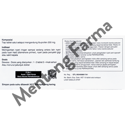Komposisi : Tiap tablet salut selaput mengandung : Ibuprofen 200 mg.