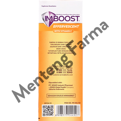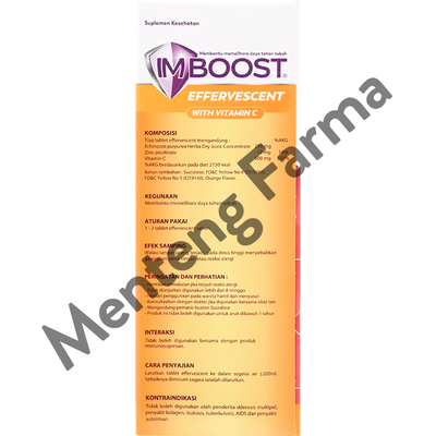 Imboost Effervescent with Vitamin C merupakan suplemen kesehatan dengan kombinasi imunomodulator + Vit C untuk mendukung sistem kekebalan tubuh agar tidak mudah jatuh sakit, serta dapat membantu memulihkan kondisi tubuh pasca sakit.