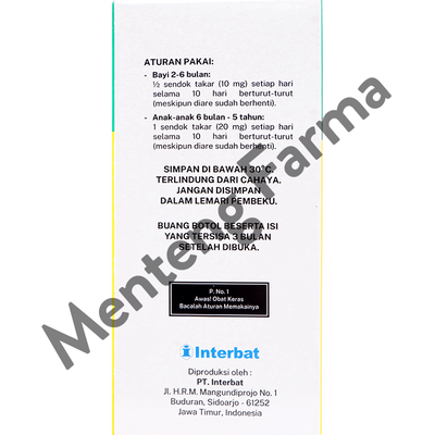 - Anak-anak 6 bulan-5 tahun: 1 sendok takar (20 mg) setiap hari selama 10 hari berturut-turut (meskipun diare sudah berhenti).