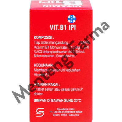 Vitamin B1 IPI adalah suplemen kesehatan yang digunakan untuk membantu memenuhi kebutuhan Vitamin B1 harian, vitamin B1 mempunyai berbagai manfaat bagi kesehatan tubuh. Vitamin ini disebut juga Tiamin yang dapat membantu sel-sel tubuh mengubah karbohidrat menjadi energi dan membantu menjaga fungsi syaraf agar tetap baik.