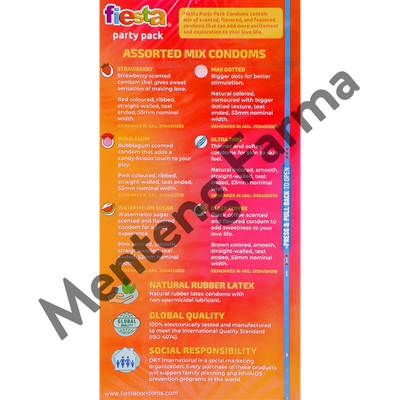 Kondom Fiesta Party Pack terbuat dari bahan lateks alami yang berkualitas tinggi dan dijamin aman untuk digunakan. Setiap kondom memiliki ukuran standar dan dilengkapi dengan pelumas untuk memudahkan penggunaan. Beberapa jenis kondom dalam paket ini juga dilengkapi dengan fitur tambahan seperti berduri atau getar untuk memberikan sensasi yang lebih menggoda.