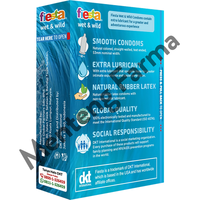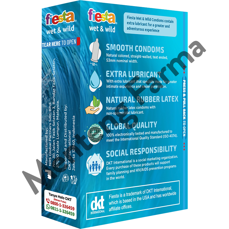 Kondom Fiesta Wet & Wild merupakan salah satu jenis kondom fiesta yang di design khusus menggunakan bahan lateks alami yang lebih tebal dan pelumas yang lebih banyak untuk memberikan pengamanan dan perlindungan secara maksimal dari kebocoran ataupun kondom terlepas ketika digunakan pada saat berhubungan. Sehingga kondom ini dapat membantu mencegah terjadinya gangguan penyakit menular seksual dan kehamilan yang tidak di rencanakan.