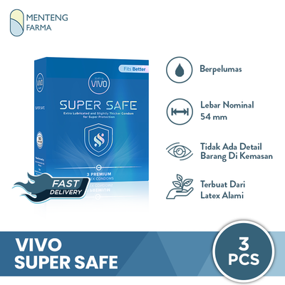 Kondom Vivo Super Safe merupakan kondom dengan ketebalan 0.05 mm, dan pelumas khusus yang tidak menyebabkan iritasi pada kulit, dibuat dengan kualitas internasional sehingga menjaga kenyamanan saat berhubungan.