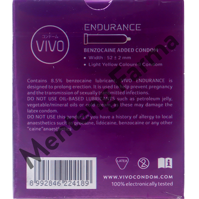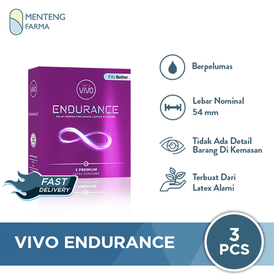 Kondom Vivo Endurance adalah kondom yang dirancang khusus untuk membantu mengurangi sensitivitas pada penis sehingga dapat membantu memperpanjang waktu berhubungan seks. Produk ini memiliki bahan pelumas yang dapat membantu mengurangi gesekan dan memberikan kelembaban pada area genital. Kondom ini aman digunakan dan memiliki standar kualitas yang tinggi.