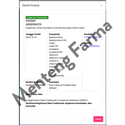 Lycoxy merupakan suplemen makanan dalam bentuk kaplet salut selaput yang terdiri dari kombinasi bahan-bahan antioksidan dan mineral yang membantu reaksi metabolisme dalam tubuh. Kombinasi lutein, lycopene dengan vitamin C, zinc, betacarotene, dan vitamin E bersifat sebagai antioksidan. Betacarotene adalah bahan alami dari tumbuhan yang dalam tubuh kita akan diubah menjadi vitamin A. Kombinasi dengan lycopene dan selenium dapat membantu memelihara daya tahan tubuh.