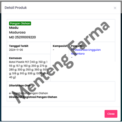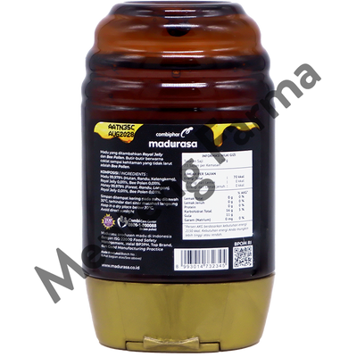 Komposisi : Madu 99,979% (Hutan, Randu, Kelengkeng), Royal Jelly 0,011%, Been Polen 0,011%