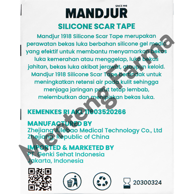 Mandjur Silicone Scar Tape bertindak untuk meningkatkan retensi air pada kulit sehingga menjaga jaringan parut tetap lembab, melembutkan dan menipiskan bekas luka. Memiliki ukuran tape yang ideal yaitu 4 cm x 150 cm sehingga bisa dipotong sesuai kebutuhan