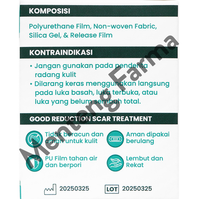 - Terbuat dari bahan silikon gel medis yang lembut, fleksibel, dan breathable shingga dapat digunakan untuk semua jenis bekas luka