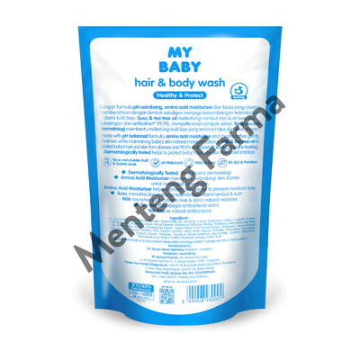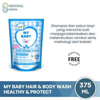 My Baby Hair & Body Wash Healthy & Protect merupakan shampoo dan sabun bayi dengan formula yang lembut dan dibuat dengan perpaduan bahan-bahan alami dapat membersihkan rambut dan badan, lembut di mata dan teruji klinis melindungi kulit dan iritasi ringan. Diperkaya dengan susu & tea tree oil untuk menutrisi,menjaga kelembaban kulit & kelembutan rambut bayi dan melindungi dari bakteri.