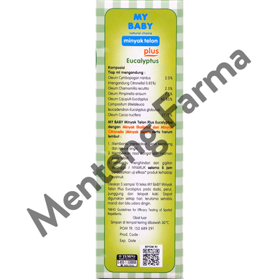 My Baby Minyak Telon Plus merupakan minyak telon yang mengandung minyak sereh (Citronella Oil) dan Chamomile yang bagus untuk menghangatkan tubuh dan melindungi tubuh dari gigitan serangga/ nyamuk. Selain itu minyak telon ini juga dapat membantu meredakan gejala masuk angin seperti perut kembung, mual, pusing, serta memberikan rasa hangat dan nyaman pada tubuh bayi.