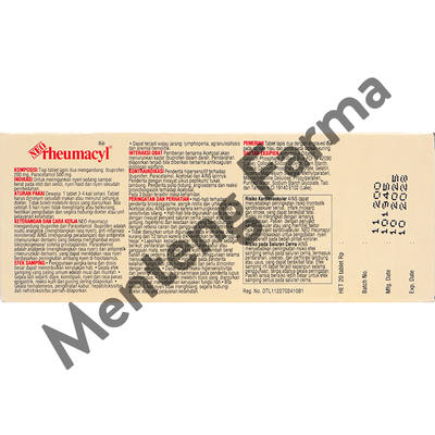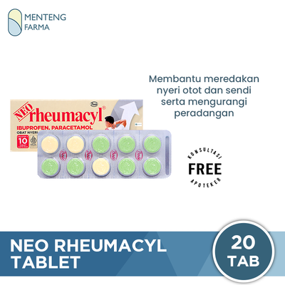 NEO Rheumacyl merupakan obat pereda nyeri otot dan sendi yang mengandung Ibuprofen dan Paracetamol. Ibuprofen adalah suatu analgesik (menghilangkan rasa nyeri), anti-inflamasi non steroid/AINS (mengurangi peradangan) dan antipiretik (menurunkan demam) yang bekerja menghambat enzim siklooksigenase/sintesa prostaglandin. Paracetamol adalah analgesik (menghilangkan rasa nyeri) dan antipiretik (menurunkan demam), yang dapat meredakan rasa nyeri berdasarkan peningkatan ambang nyeri di hipotalamus.