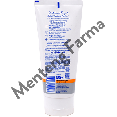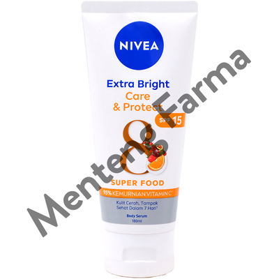 Nivea Extra Bright Care & Protect 8 Super Food SPF15 Body Serum 180 ml merupakan body serum dengan tekstur ringan, tidak lengket, mengandung 95% kemurnian vitamin C dan 8 super skin foods. Body serum nya intensif meresap ke lapisan kulit terdalam, memperbaiki 8x tanda kulit kusam dan rusak untuk kulit tampak lebih cerah lebih nyata. Cocok untuk kulit sensitif saat terkena sinar matahari dan telah diuji secara dermatologi cocok untuk kulit