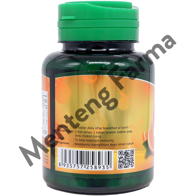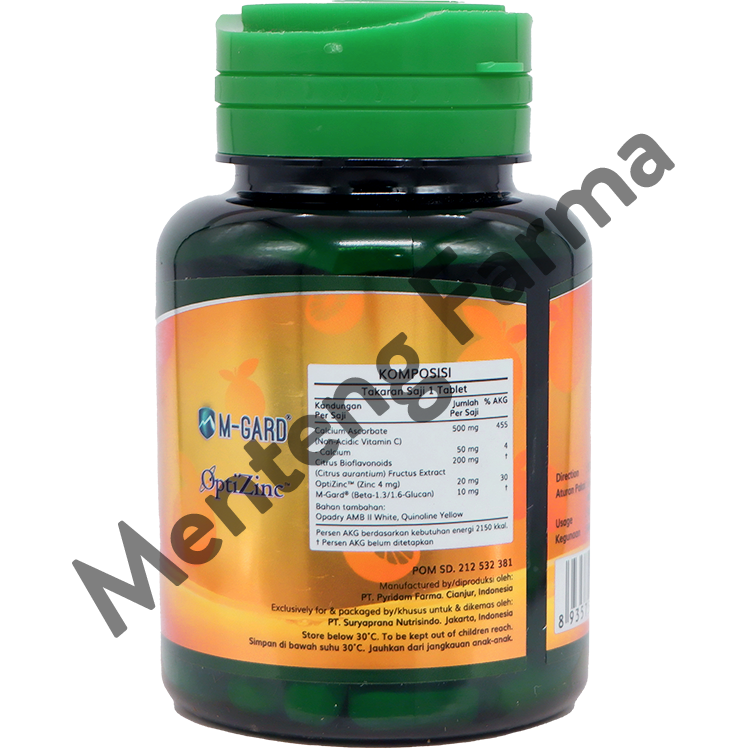 Komposisi: Calcium Ascorbate (Non-Acidic Vitamin C) 500 mg, Calcium 50 mg, Citrus Bioflavonoids (Citrus aurantium) Fructus Extract 200 mg, OptiZinc (Zinc 4 mg) 20 mg, M-Gard (Beta-1.3/1.6-Glucan) 10 mg dengan bahan tambahan Opadry II 85G58977 White, Quinoline Yellow