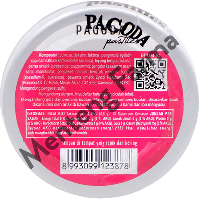 Pagoda Pastiles adalah permen pelega tenggorokan yang terbuat dari ekstrak bahan-bahan alami dan ramuan herbal, seperti peppermint oil dan eucalyptus oil. Pagoda Pastiles dikenal karena dapat memberikan efek pelega dan meredakan rasa sakit pada tenggorokan.