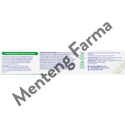 Polident Perekat Gigi Palsu membantu meningkatkan kenyamanan pada saat menggunakan gigi palsu. Tidak hanya merekat sepanjang hari, tetapi juga meningkatkan daya kunyah pada saat makan hingga 12 jam. Jadi tidak perlu khawatir untuk menjalani aktivitas seperti biasa,dengan rasa dan aroma mint yang menyegarkan.