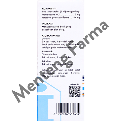 Prome Sirup 100 mL adalah obat batuk yang diformulasikan khusus untuk mengatasi batuk alergi. Obat ini mengandung bahan aktif promethazine HCl, yang bekerja sebagai antihistamin dan mengurangi gejala alergi yang menyebabkan batuk.