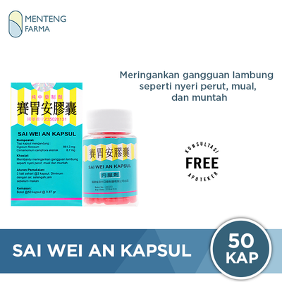 Sai Mei An Kapsul (Jiao Nang) berkhasiat mengobati luka atau peradangan pada usus dan lambung, mengatasi kelebihan asam lambung, mengurangi nyeri pada perut, melindungi alat pencernaan. Obat ini terbuat dari bahan alami yang berfungsi menetralkan asam lambung dan mengurangi peradangan, serta Bernoel ( bing pian) yang berfungsi mengurangi rasa nyeri atau sakit
