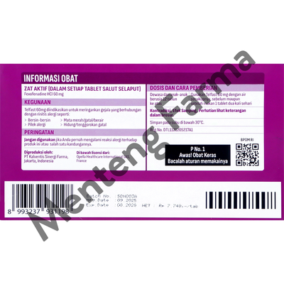 Komposisi : Setiap tablet salut selaput mengandung zat aktif fexofenadine HCl 60 mg