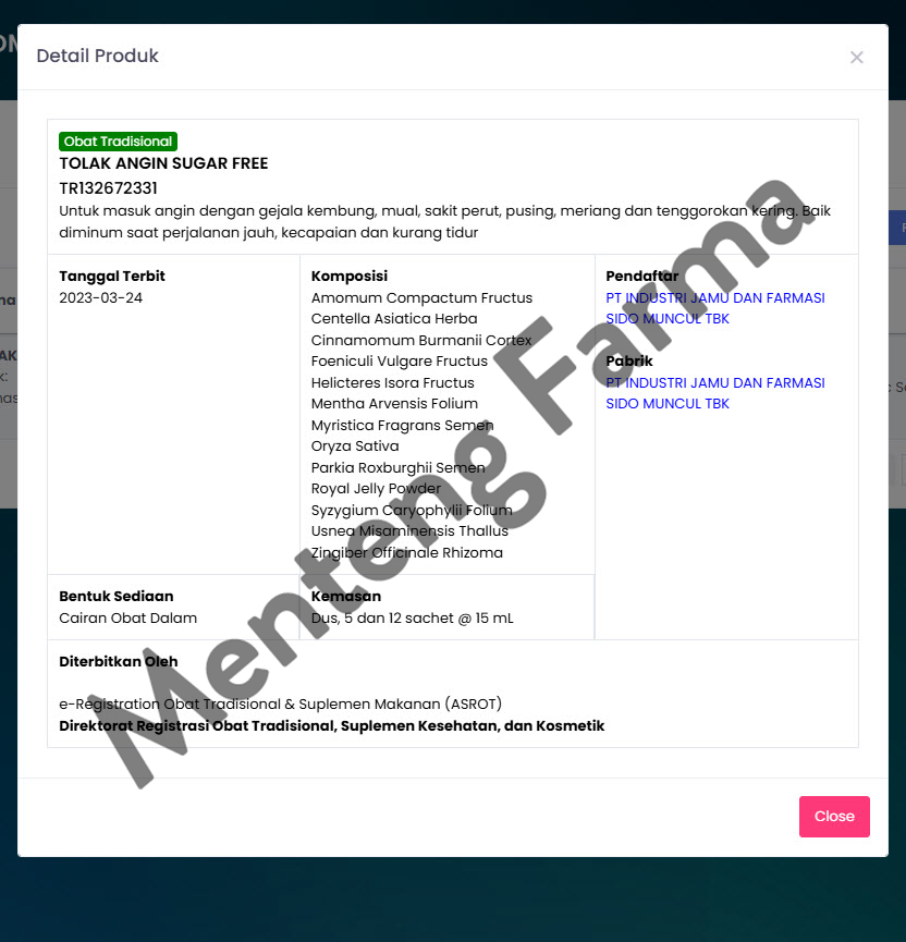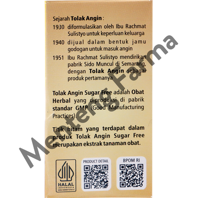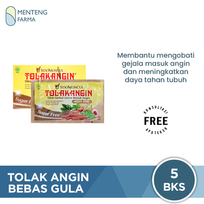 Tolak Angin Bebas Gula merupakan salah satu varian tolak angin yang dihadirkan khusus untuk konsumen yang tidak terlalu menyukai rasa manis dan penderita diabetes. Tolak Angi Bebas Gula ini terbuat dari bahan-bahan alami dan diproduksi di pabrik berstandar GMP (Good Manufacturing Practice) yang mana memiliki manfaat yang hampir sama dengan Tolak Angin Cair yaitu sebagai obat herbal untuk mengatasi masuk angin dan gejalanya seperti : mual, perut kembung, badan meriang, dan demam.